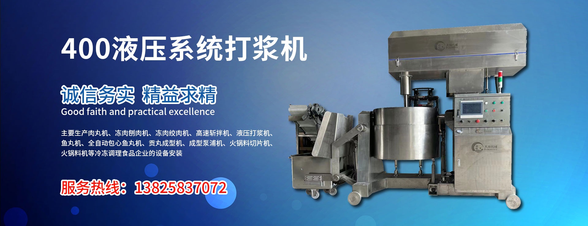 汕頭市大海機(jī)械設(shè)備有限公司是一家集設(shè)計,研發(fā),生產(chǎn),銷售為一體的食品機(jī)械設(shè)備生產(chǎn)公司,企業(yè)造就了一支素質(zhì)高,技術(shù)過硬的技術(shù)人員和員工隊(duì)伍,擁有先進(jìn)的制作工藝和精良的設(shè)備,確保了大海食品機(jī)械產(chǎn)品的優(yōu)良品質(zhì)。主要生產(chǎn)肉丸機(jī),凍肉刨肉機(jī),凍肉絞肉機(jī),高速斬拌機(jī),液壓打漿機(jī),魚丸機(jī),全自動包心魚丸機(jī),貢丸成型機(jī),成型泵浦機(jī),火鍋料切片機(jī),火鍋料機(jī)主等冷凍調(diào)理食品企業(yè)的設(shè)備安裝,工藝設(shè)計及老廠技術(shù)改造等成套輸出終端解決方案。